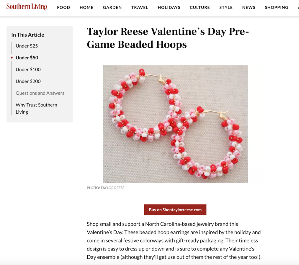 Our best-selling pre-game beaded hoops were recolored for Valentine's Day and featured in Southern Living: The 46 Best Valentine's Day Gifts of 2024.