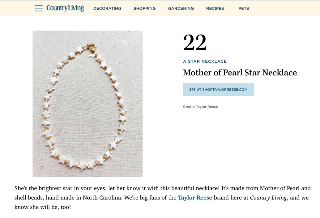 The Mother of Pearl and Star Necklace was featured in Country Living's Christmas Gift Guide: 79 Christmas Gifts Teenage Girls Are Going to Be Obsessed With This Year.