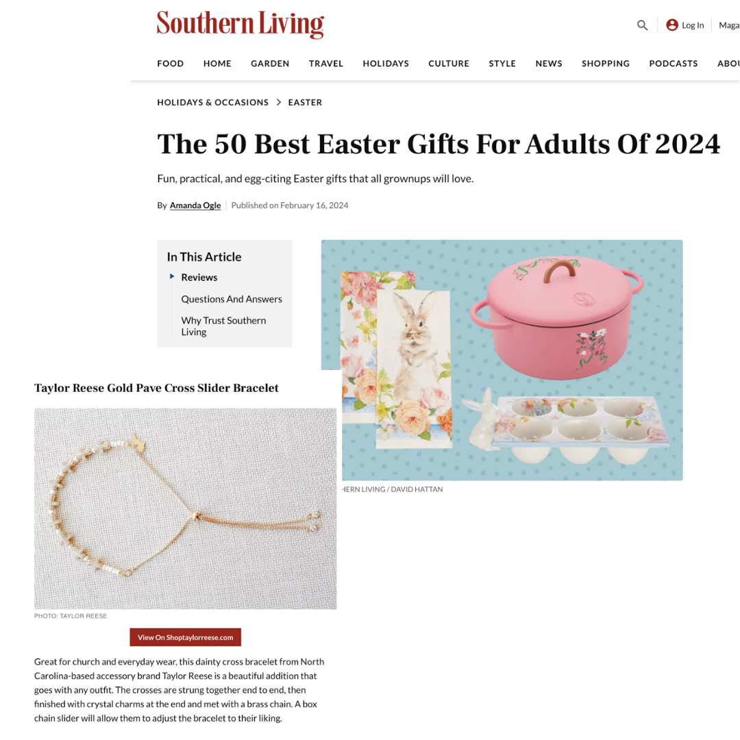 The Gold pave cross slider bracelet was featured in Southern Living's Easter Gift Guide: The 50 Best Easter Gifts For Adults Of 2024.