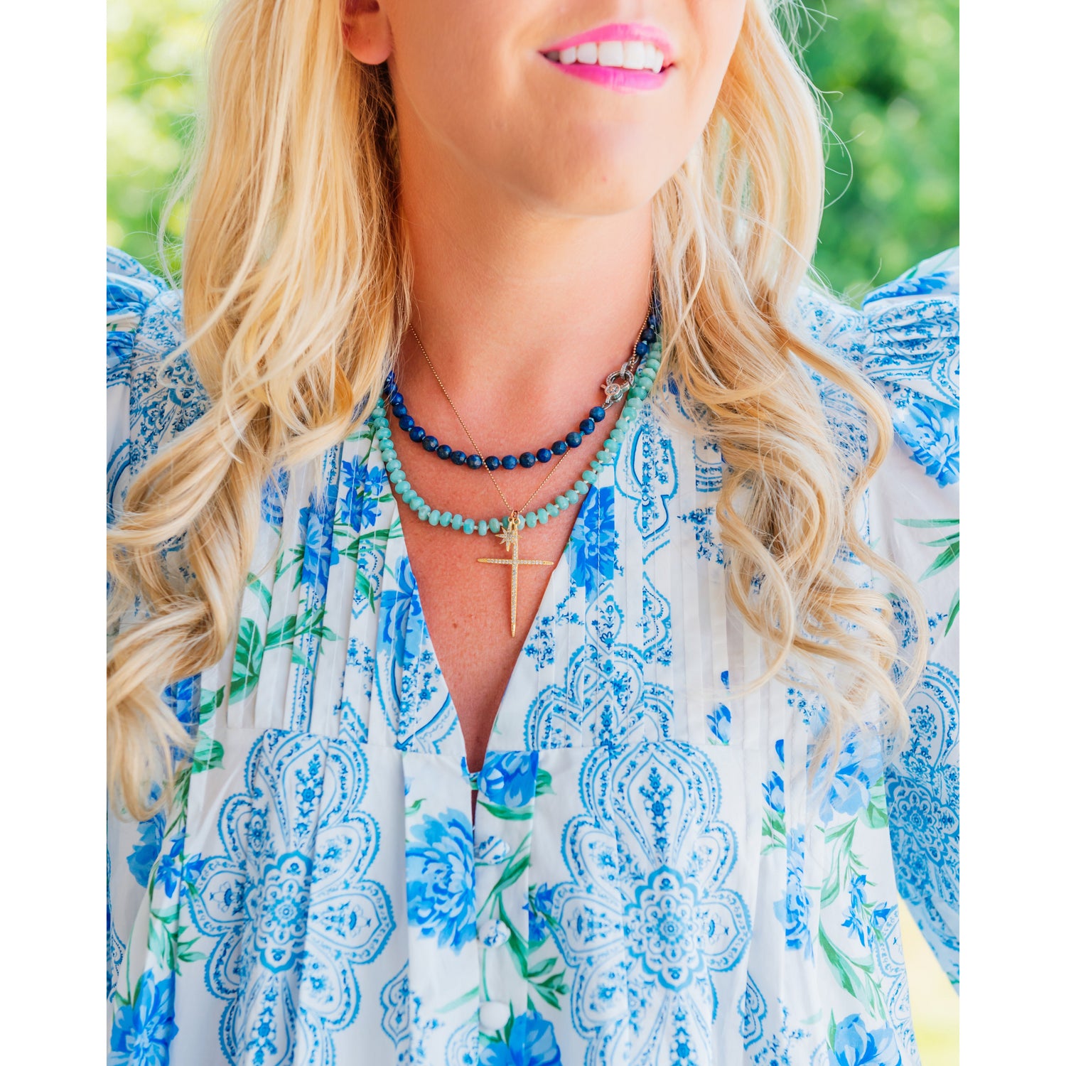 This amazonite candy crush necklace is made of genuine stones with silk cording. Every necklace will be hand-knotted and affixed with pave CZ lobster clasps.