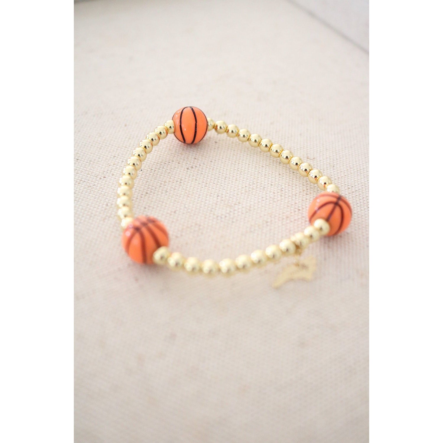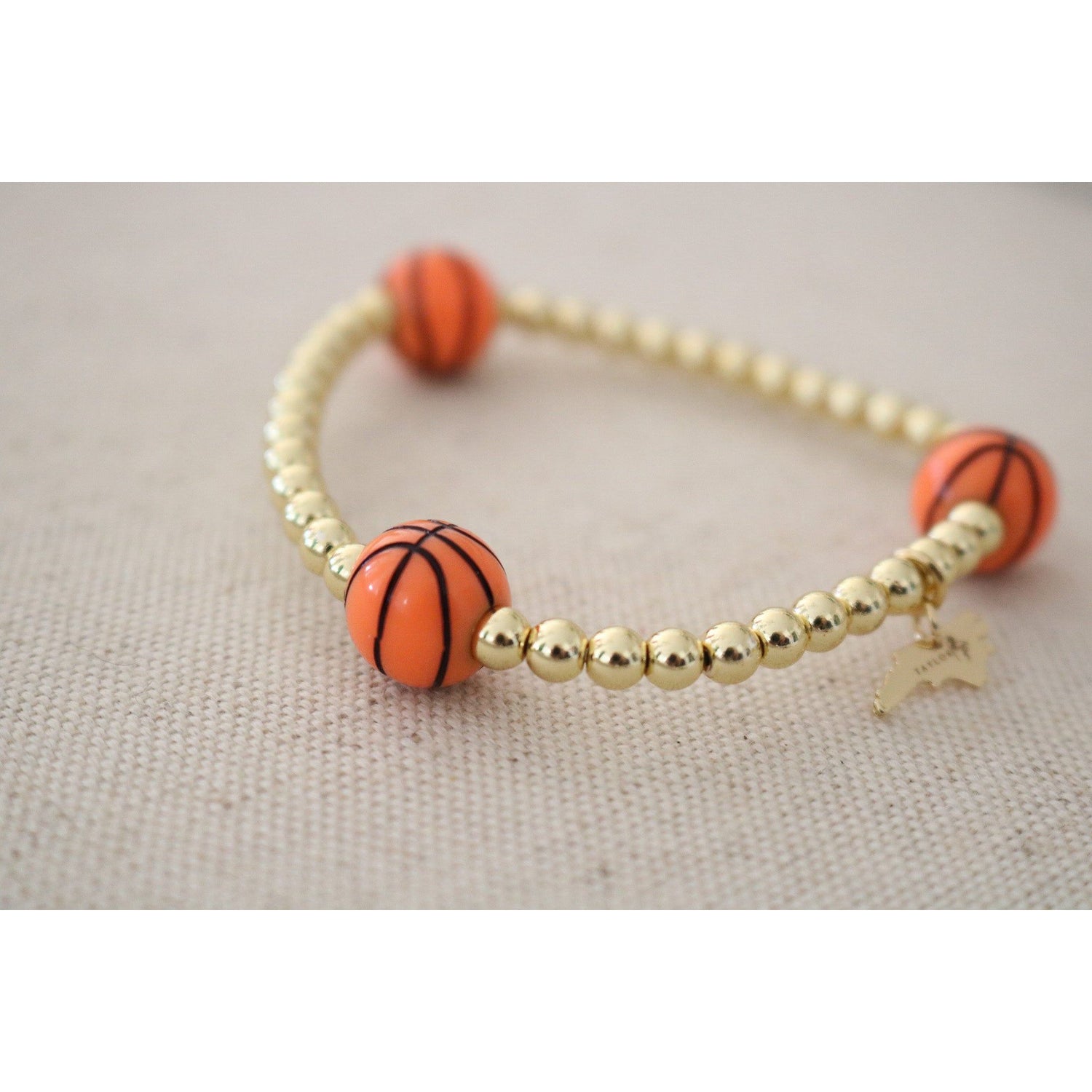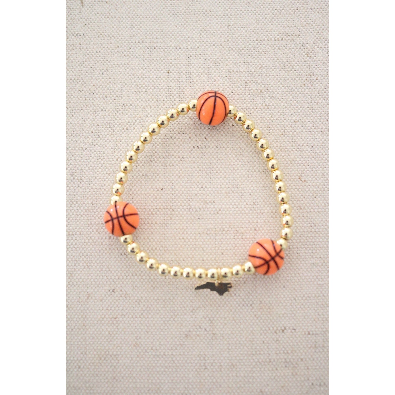 A new addition to the goldie family is this fun basketball. 3 small basketball beads are spaced by gold hematite ball beads and finished with our signature NC brand tag.