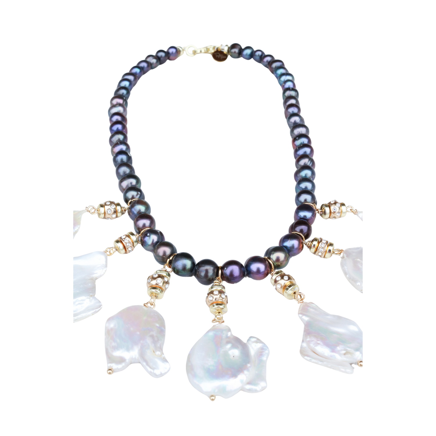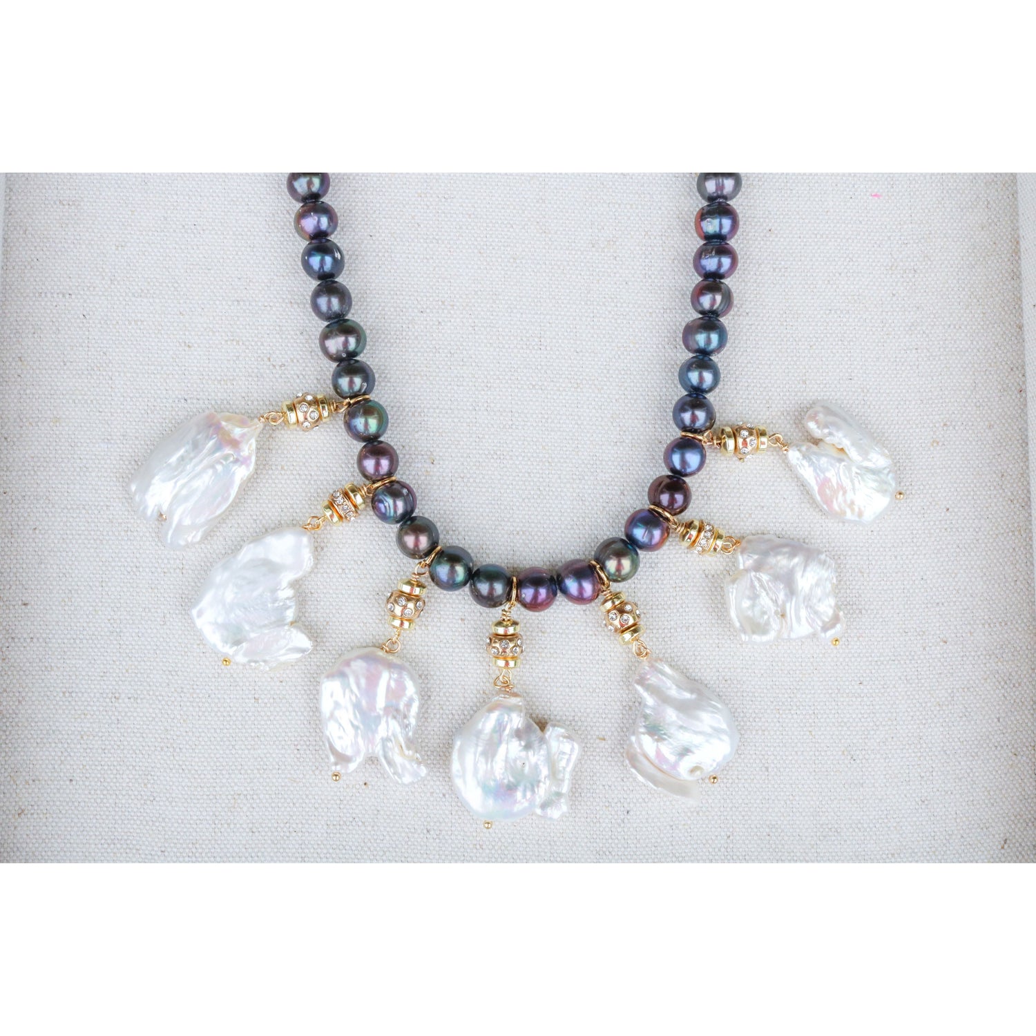 Bold. Unapologetic. Iconic. The Caviar & Chips Necklace is the ultimate expression of festive luxury with a wink of playfulness. Featuring a strand of deep, iridescent black pearls that shimmer in peacock tones, this statement piece brings richness and depth to any holiday look.