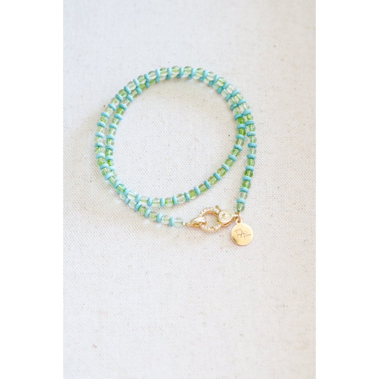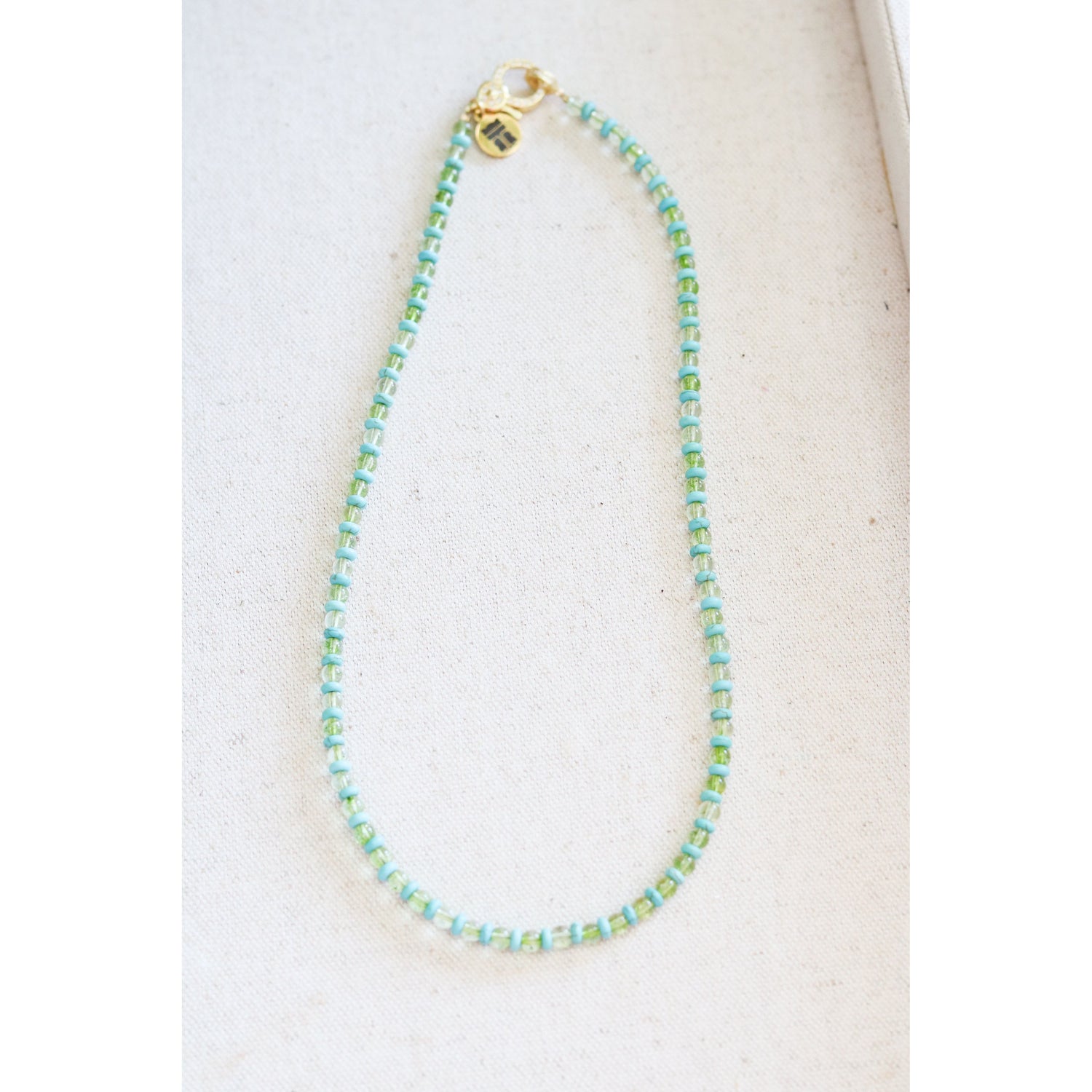 A blue and green lovers dream! This single-strand necklace features alternating rondelle howlite beads and round glass beads on a braided cord and is finished with our signature pave lever clasp. This strand is perfect for pairing with a cluster (or just one) of your favorite charms + pendants.