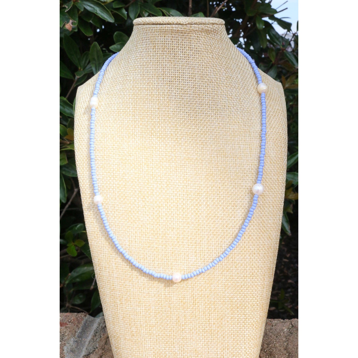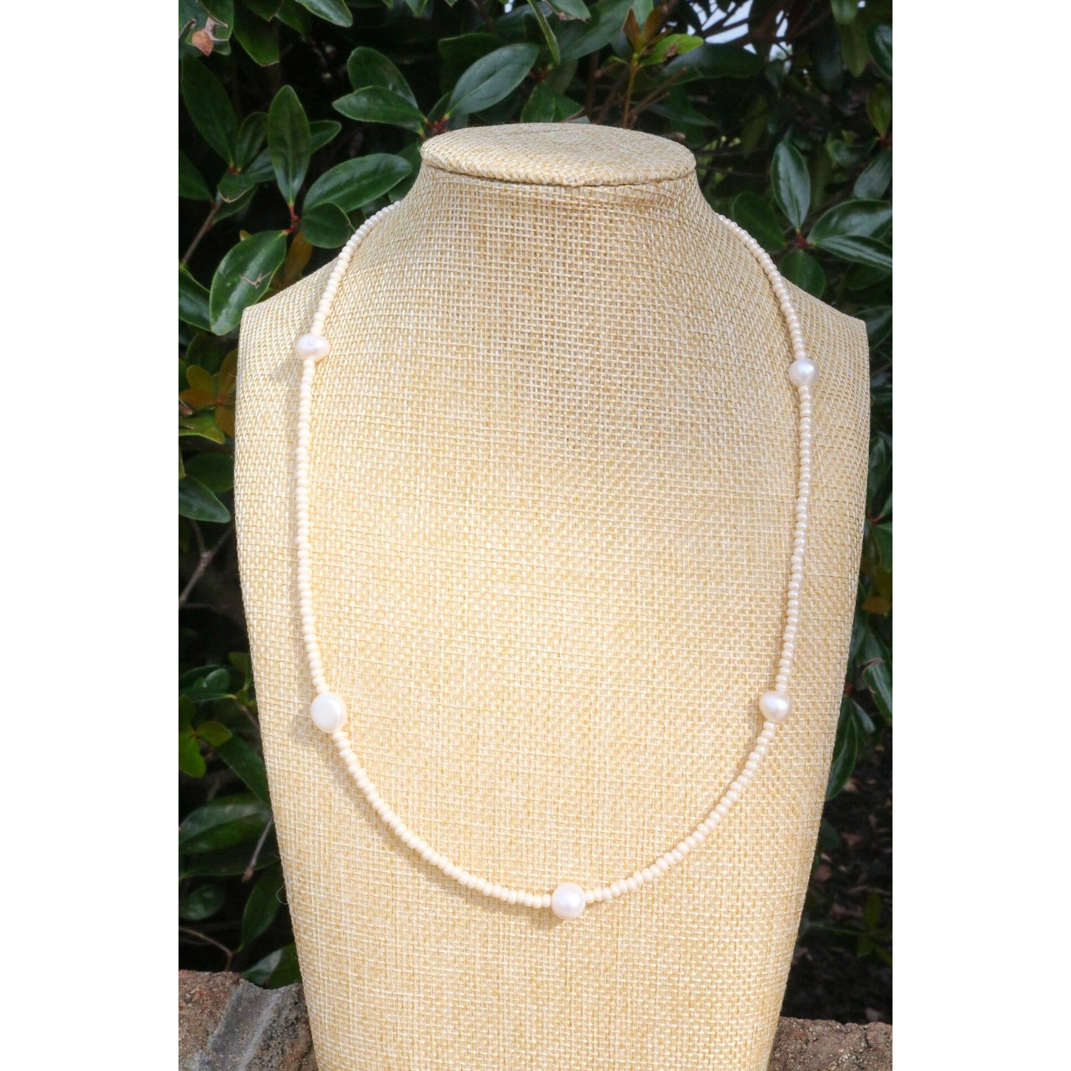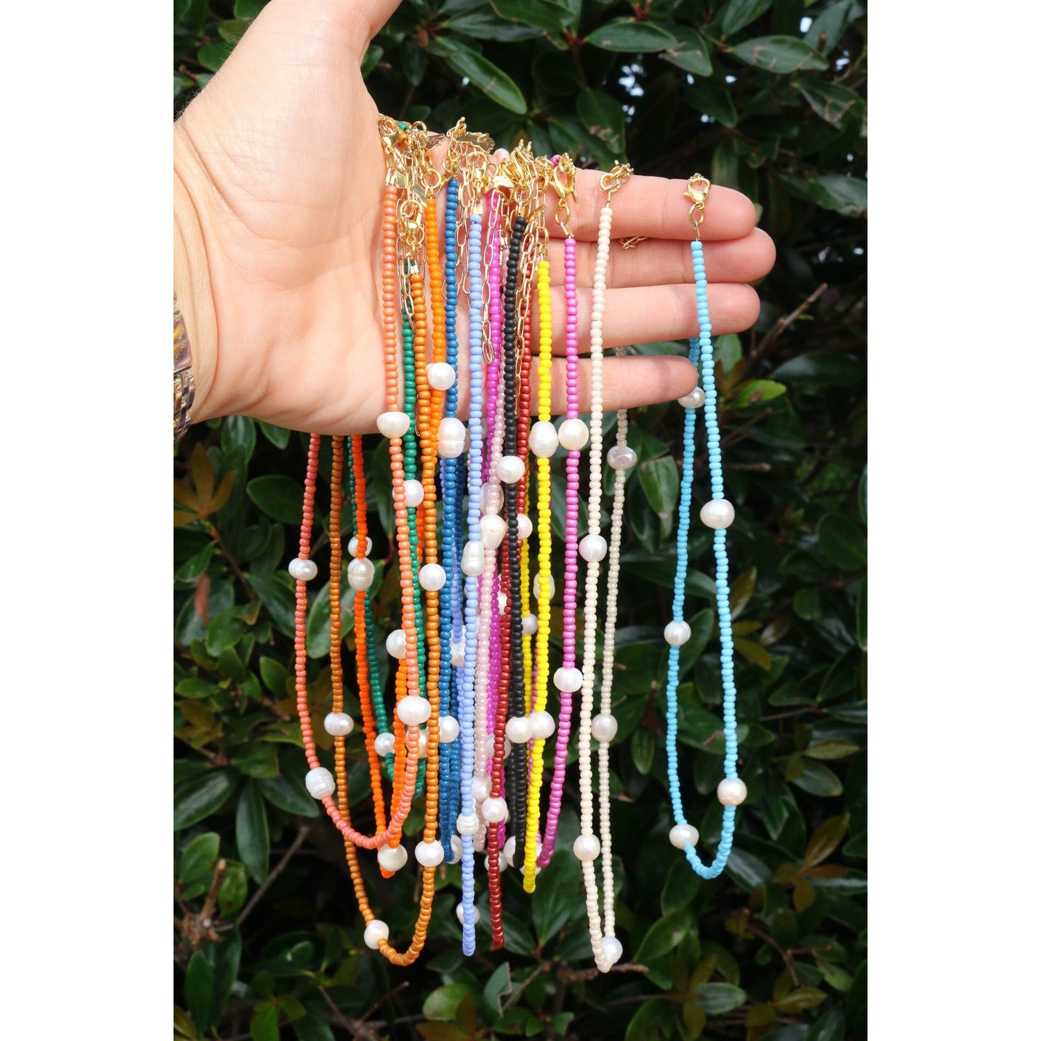 A dainty yet stackable choker necklace comes in your fave color or your team's best color. 5 baroque pearls are separated by smooth glass beads on cord. Adjust it to your length with a claw clasp and extender at end.