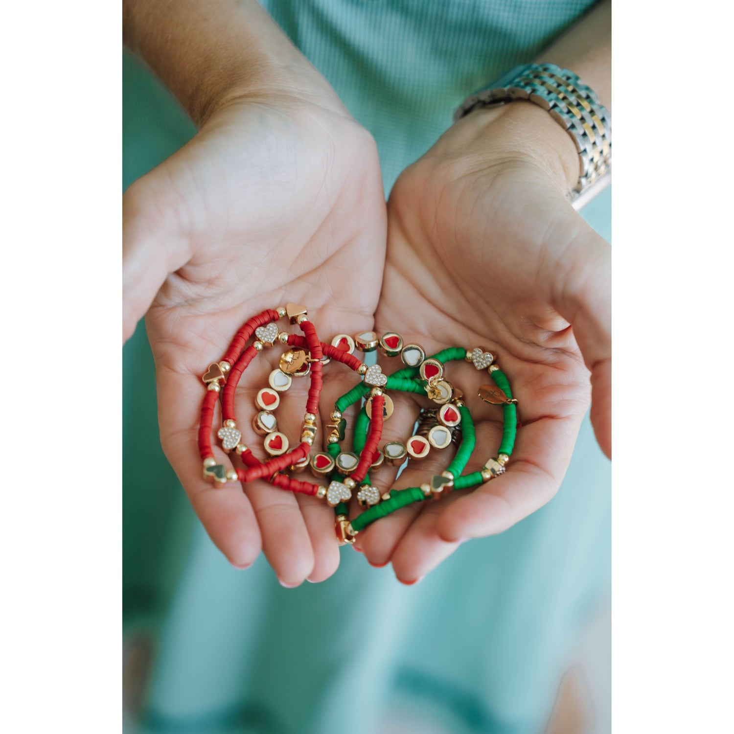 Spice up your stack with the red Anniversary Heart Bracelet. Featuring vibrant red vinyl beads, glimmering pavé crystal hearts, and gold accents throughout, this stretchy number delivers playful polish with a powerful purpose.