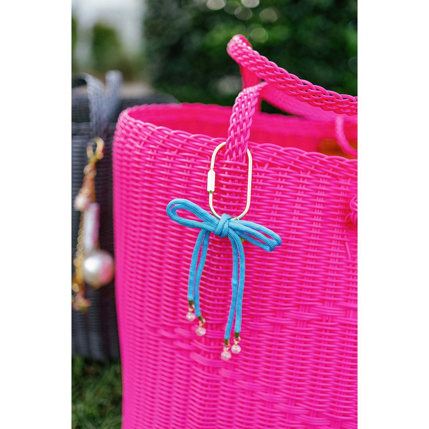 Bows aren't just for gifts! Tie your bag up with a bow and call it effortlessly chic. The Bow & Tell charm clip features a playful loop of ocean-blue cord, knotted into the perfect bow and finished with tiny crystal drops that sway with every step. It’s clipped to a sleek gold carabiner-style clasp that makes it a breeze to attach to totes, handles, or clutches.