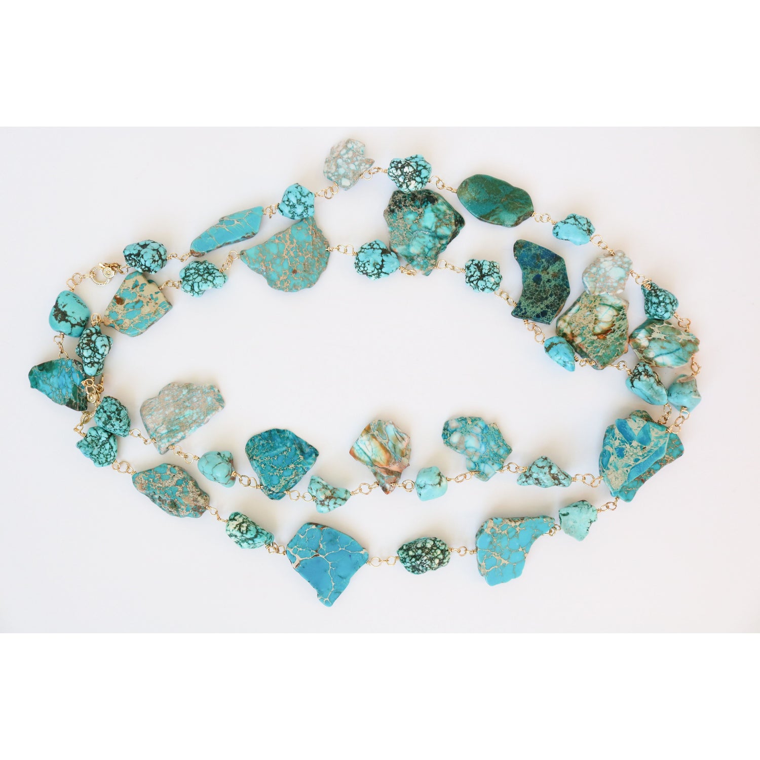 Make a striking statement with the Turquoise Ranch Necklace, a bold, artful piece that celebrates the raw beauty of nature through organic shapes and vivid turquoise hues. Handcrafted with a curated mix of natural turquoise and veined jasper and howlite stones, each link showcases unique marbling in shades of aqua, teal, and ocean blue, kissed with gold wire wrapping that enhances the stone’s natural luster.